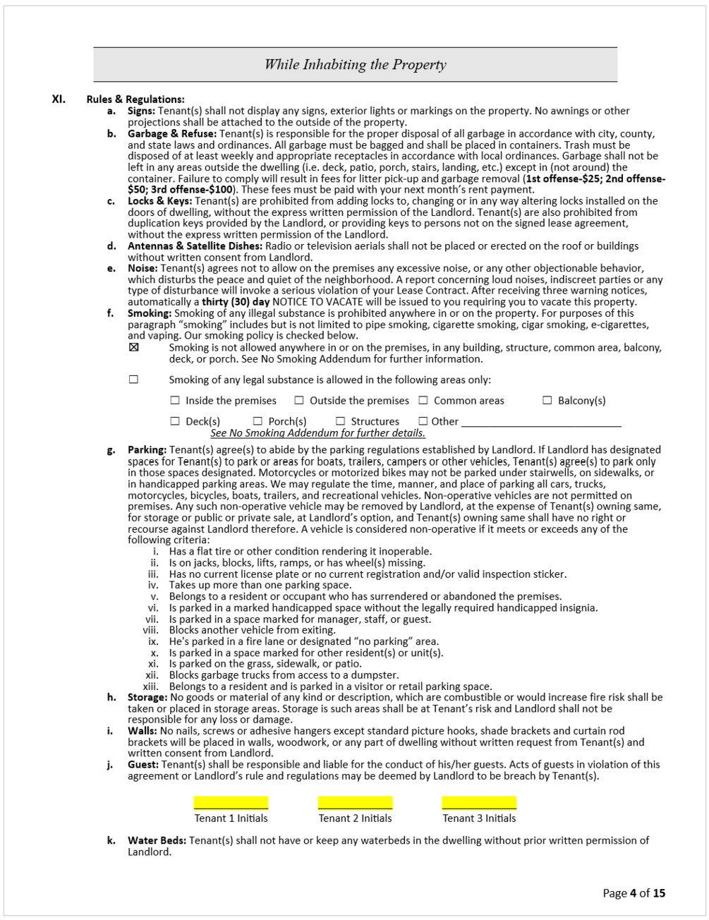 - Lease Agreement: This 15 page agreement is what we use as our binding contracts for tenancy between the company and the tenants. This is a very inclusive agreement with excellent verbiage and ideas for real estate investors to consider in their own agreements. The fantastic formatting and multiple tenant initial sections ensure the tenants have read and understood the agreement and its subsections.
