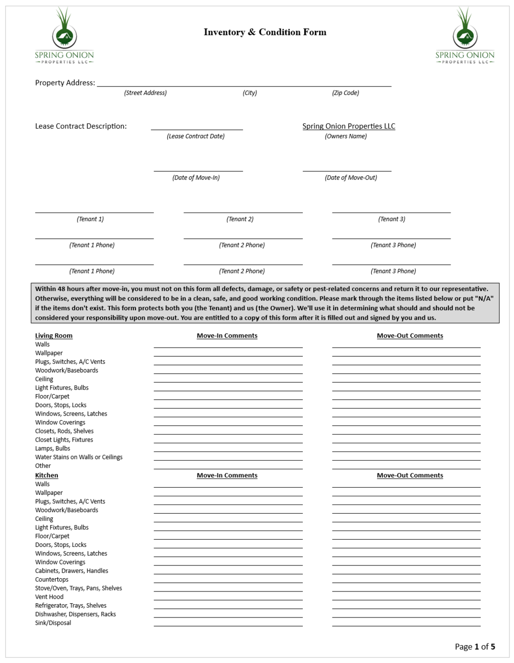 - Inventory and Condition Form: This 5 page document is what we use to inspect the property with the tenant during move in and move out to accurately and properly document the condition the property is in before and after the tenant's occupancy.